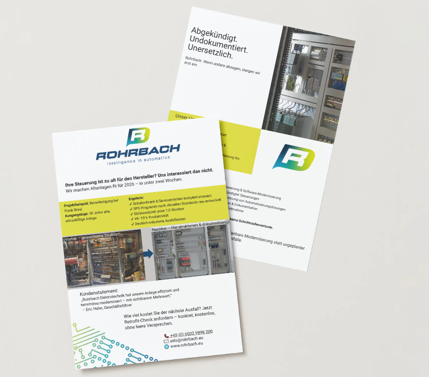 Unsere zwei neuen Flyer zeigen, wie Produktionsunternehmen mit Rohrbach Elektrotechnik Kosten senken und Anlagen zukunftssicher machen.